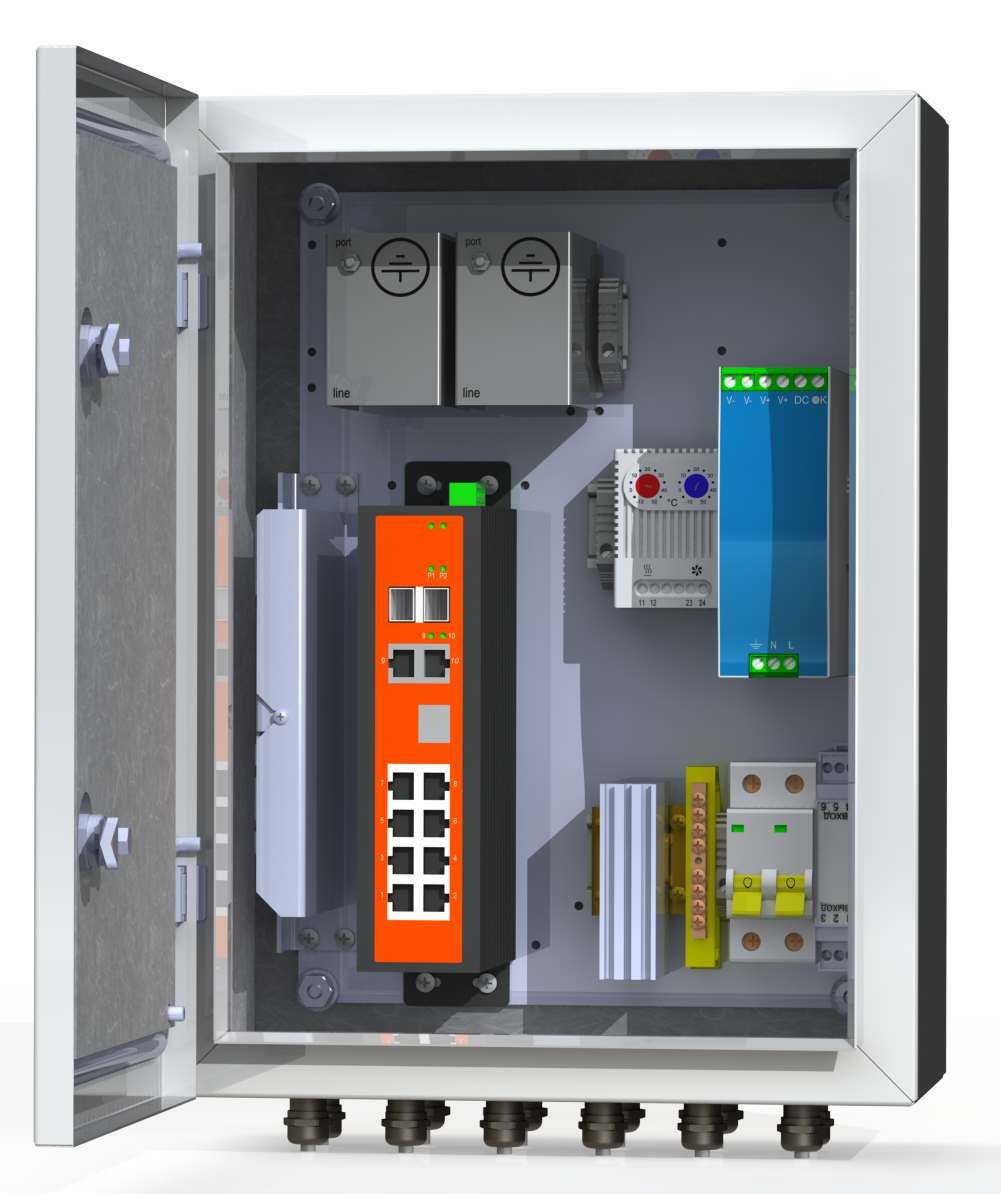 Двухполюсный защитный автомат 6А - 1 шт.Обогреватель 50Вт - 1 шт. Сдвоенный термостат - 1 шт. Блок питания 240Вт -1 шт. Промышленный неуправляемый коммутатор 8*PoE 802.3 af/at (бюджет 230 Вт), 2*combo SFP - 1 шт. Оптический кросс 4 порта SC/SM - 1 шт. Устройство грозозащиты линии 220В -1 шт. Устройство грозозащиты линий PoE -2 шт. Гермовводы 8*PG9, 4*PG13,5 -1 комплект.