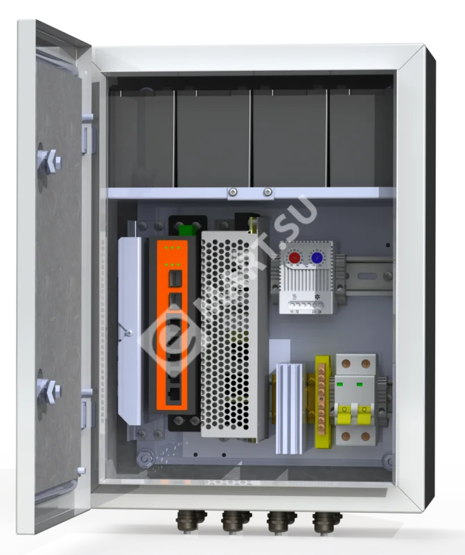 Двухполюсный защитный автомат 6А - 1 шт. Обогреватель 50Вт - 1 шт. Сдвоенный термостат - 1 шт. Блок бесперебойного питания 155Вт -1 шт. Аккумулятор 12В, 7А/ч - 4 шт. Промышленный управляемый коммутатор 4*PoE 802.3 af/at (бюджет 140 Вт), 2*SFP, 1*console port - 1 шт. Оптический кросс 4 порта SC/SM - 1 шт. Гермовводы 4*PG9, 4*PG13,5 -1 комплект.