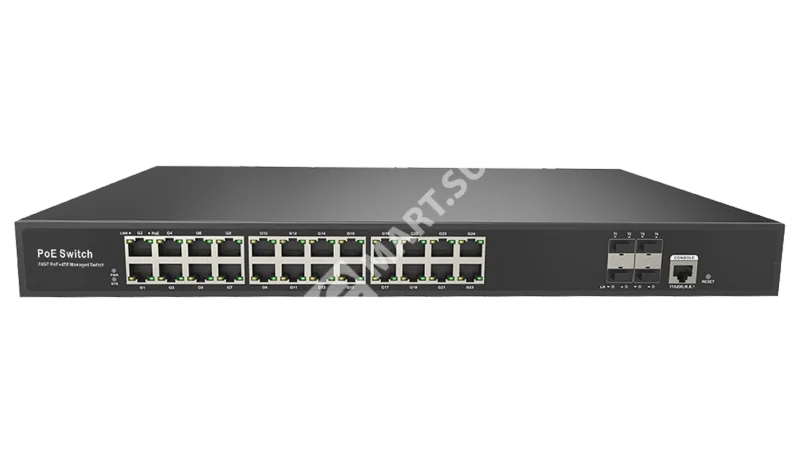 Сетевой коммутатор RVi-2NSM24G-4SP rev.2 - это 28 портовый коммутатор с функциями управления L3 предназначен для подключения конечных устройств (сетевые видеокамеры, сетевые видеорегистраторы, коммутаторы и др.), рабочих станций, серверов, соединения нескольких узлов компьютерной сети в пределах одного или нескольких сегментов, а также передачи электропитания с использованием технологии PoE. Он обеспечивает управление трафиком на основе адресов MAC, поддерживает VLAN и Quality of Service (QoS) для обеспечения надежной и безопасной передачи данных.