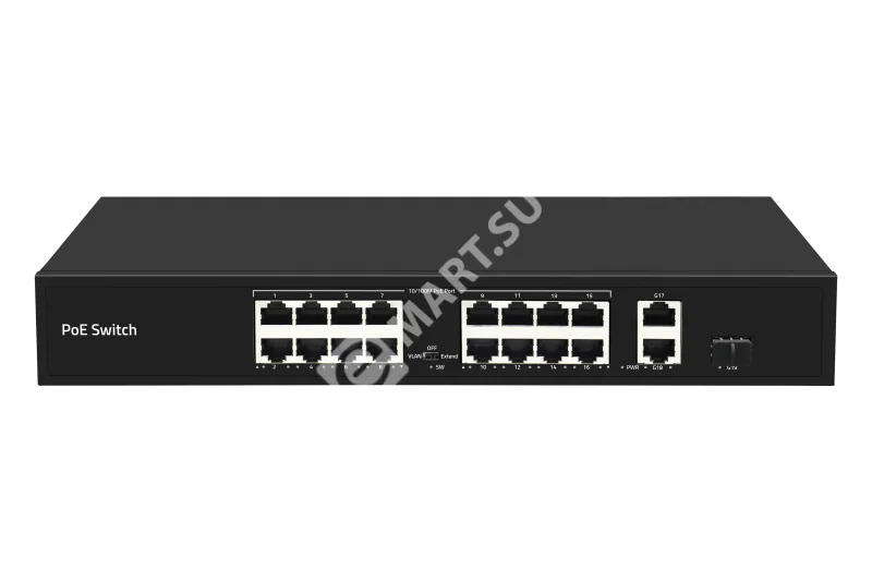 Неадминистрируемый коммутатор, 16 RJ-45 POE портов (10/100 Мбит/с), 2 RJ-45 Uplink порта (1000 Мбит/с), 1 SFP порт (1000 Мбит/с), бюджет на порт до 30 Вт, общий бюджет до 300 Вт.