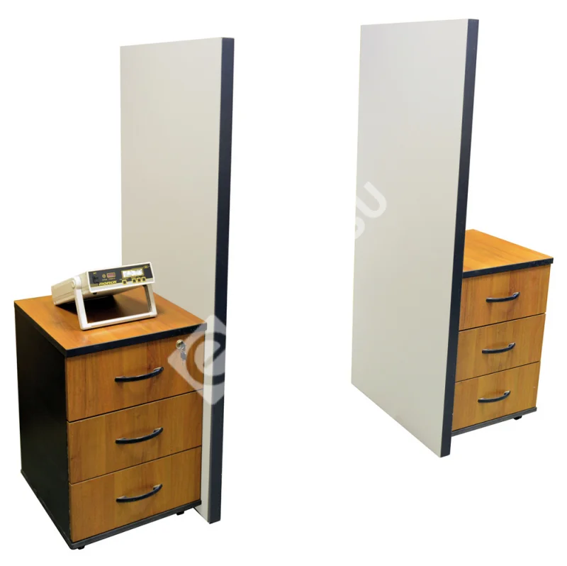 Выполнен в виде двух панелей, образующих контролируемый проход, и электронного блока, подключаемого к ним с помощью кабелей. Отсутствие привычной арочной формы позволяет легко закамуфлировать изделие под детали внутреннего интерьера и осуществлять контроль, не привлекая лишнего внимания входящих.