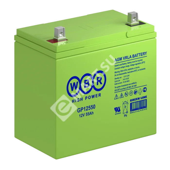 Аккумулятор WBR GP12550 - герметизированная, выполненная по технологии AGM, аккумуляторная батарея общего применения со сроком службы до 8 лет в буферном режиме или 260 циклов заряда-разряда в циклическом режиме при 100% разряде. Эта высокоэффективная, перезаряжаемая батарея, не требующая обслуживания в течение всего срока службы.