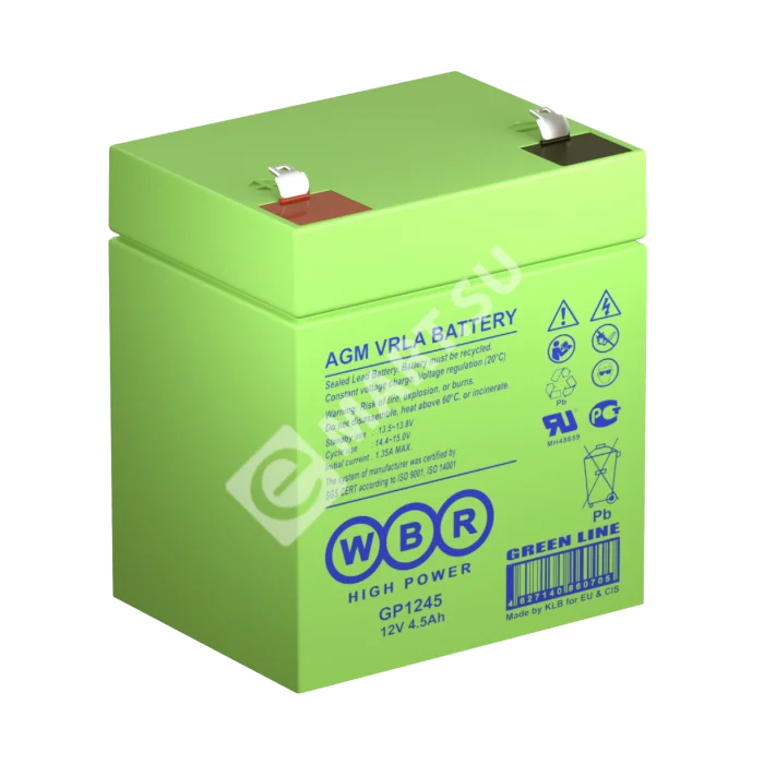Аккумулятор WBR GP1245 - герметизированная, выполненная по технологии AGM, аккумуляторная батарея общего применения со сроком службы до 8 лет в буферном режиме или 260 циклов заряда-разряда в циклическом режиме при 100% разряде. Эта высокоэффективная, перезаряжаемая батарея, не требующая обслуживания в течение всего срока службы.