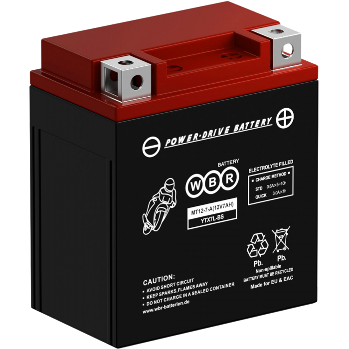 Аккумулятор WBR МТ12-7-А - герметизированная, выполненная по технологии AGM, необслуживаемая (MF) стартерная мотоциклетная свинцово-кислотная аккумуляторная батарея. Обладает высоким качеством и надежностью. Она предназначена для запуска двигателя мотоциклов, скутеров, гидроциклов, квадроциклов, снегоходов и мотовездеходов. Батарея соответствует техническим характеристикам и является аналогом мотоциклетных аккумуляторных батарей YUASA модели YTX7L-BS.