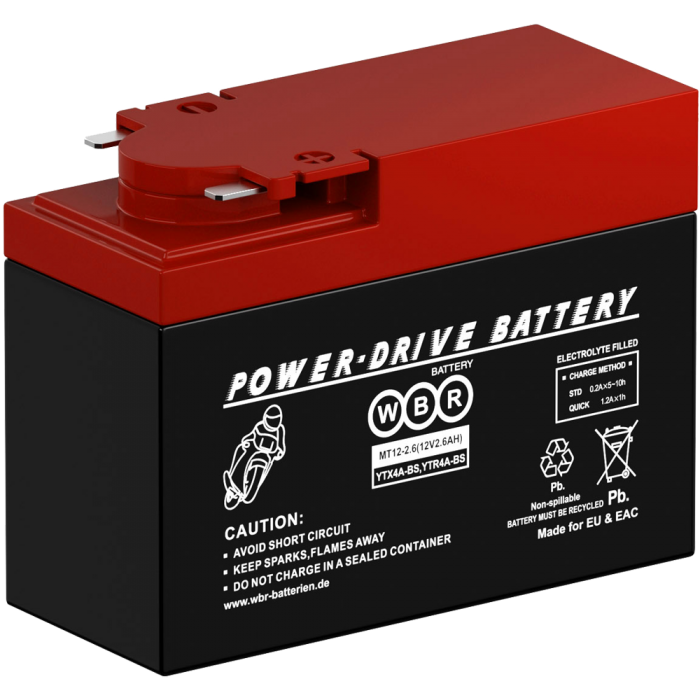Аккумулятор WBR МТ12-2,6 - герметизированная, выполненная по технологии AGM, необслуживаемая (MF) стартерная мотоциклетная свинцово-кислотная аккумуляторная батарея. Обладает высоким качеством и надежностью. Она предназначена для запуска двигателя мотоциклов, скутеров, гидроциклов, квадроциклов, снегоходов и мотовездеходов. Батарея соответствует техническим характеристикам и является аналогом мотоциклетных аккумуляторных батарей YUASA модели YTX4A-BS.