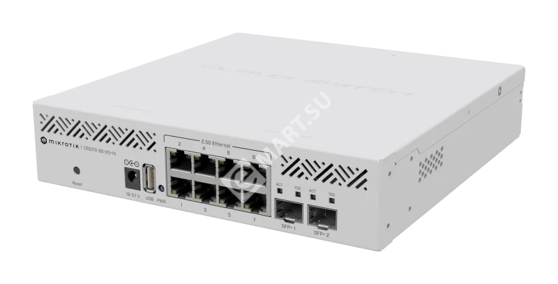 CRS310-8G+2S+IN — продвинутый L3-коммутатор с функциями маршрутизатора от MikroTik, обладающий процессором 98DX226S 800 МГц архитектуры ARM 32bit с 256 Мб RAM и 32 Мб Flash-памяти. Устройство имеет 8 Ethernet-портов (2,5 Гбит/с), 1 порт USB (type A) и 2 SFP+ (10 Гбит/с) порта для оптических соединений. Работает под управлением операционной системы RouterOS v7 Level 5. Форм-фактор устройства предполагает его монтаж в коммутационную стойку 19 дюймов (крепеж входит в комплект поставки) или на столе. Также можно приобрести крепёж RMK-2/10, который позволяет установить 2 коммутатора меньшего форм-фактора в стандартную 19-дюймовую стойку высотой 1U или смонтировать 1 коммутатор в 10-дюймовую стойку, удалив часть крепления.