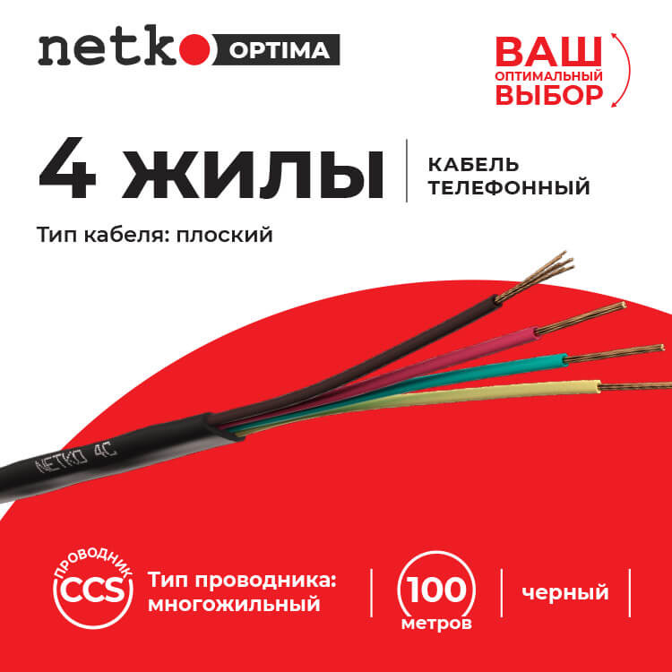 –Netko Кабель Телефонный 4с, CCS, 100м, плоский, черный Optima