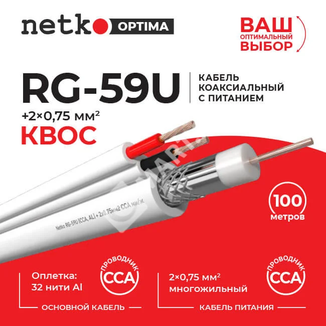 Netko Кабель коаксиальный RG-59U, 75 Ом (CCA, оплетка 32 нити AL) + кабель питания 2x0.75 мм2